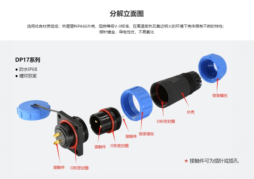 DP17 系列航空插头由锁紧螺外壳、O 型密封圈及各接插件组成。保障连接器传输稳定,又强化航空插头防水防尘性能