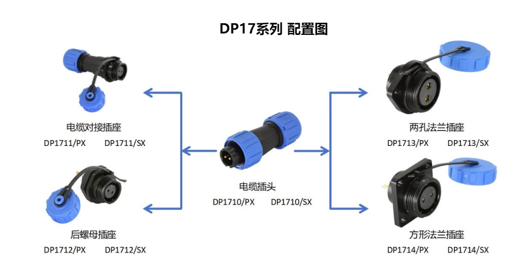 DP17 系列航空插头直式电缆插头、弯式电缆插头与DP17系列电缆对应插座、DP17系列后螺母插座、DP17系列两孔法兰插座、DP17系列方形法兰插座等自由组合。用户可依安装空间、连接方式及设备需求灵活选用适配的DP17 系列航空插头类型。​