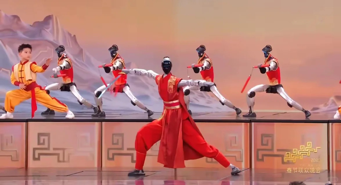 运动中枢:从“机械模仿”到“灵动适配”,掌控精准运动新节奏。运动中枢负责协调动作、维持平衡,今年的突破在于自适应运动控制算法与实时动力学模型的应用,可根据舞台环境自主调整步态幅度,避免失衡卡顿。武术《武BOT》中,宇树科技26台机器人与河南塔沟武校少年同台“人机共武”,全自主完成空翻、双截棍、马步等高难度招式,集群控制同步误差低于0.1秒,精准跟拍武术节奏、默契攻防对练。这背后得益于力控技术与仿生步态算法——关节力控传感器实时感知受力,毫秒间调整扭矩;仿生算法借鉴人类运动规律,让步伐更自然协调,尽显精准操控力。